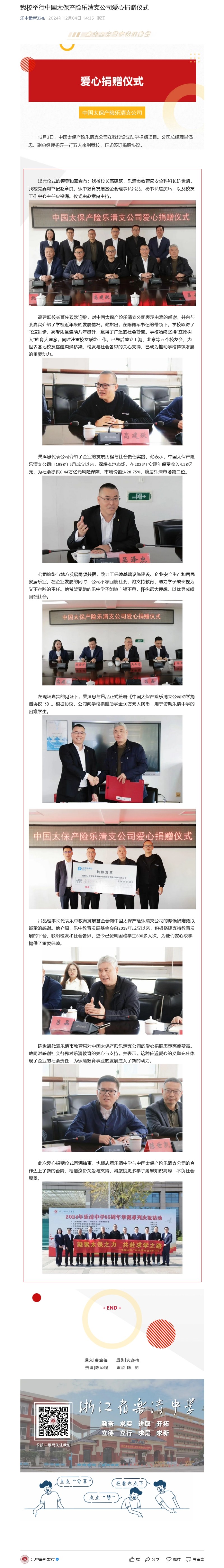 我校举行中国太保产险乐清支公司爱心捐赠仪式